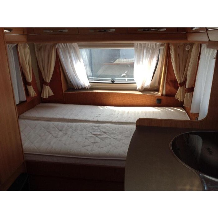 In het ruime, dwars geplaatste bed kunnen 2 personen slapen. U kunt in deze caravan genieten van een weldadige nachtrust dankzij de lattenbodems en pocketveringsmatrassen op de bedden.