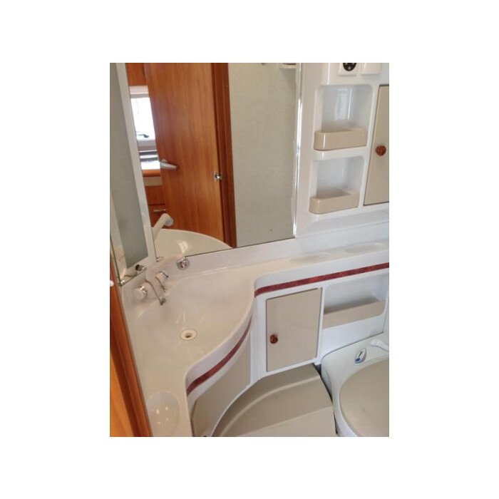 Het royale tweepersoons bed is dwars in de caravan geplaatst. Aan slaapcomfort zal het u in deze caravan, die is voorzien van lattenbodems en pocketveringsmatrassen, niet ontbreken. In de badkamer, waar deze caravan over beschikt, vindt u een ingebouwd cassettetoilet en een wastafel.