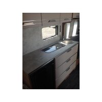 De ruime rondzit, waar deze caravan over beschikt, kan ook als slaapgelegenheid worden gebruikt. Het keukenblok is centraal in de caravan geplaatst. Voor een snelle toevoer van warm water is er een boiler aanwezig. Om uw etenswaren op te bergen is er een koelkast met vriescompartiment ingebouwd.