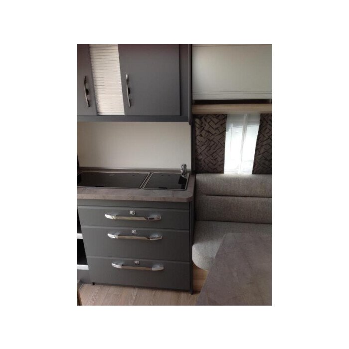 De caravan beschikt over een treinzit. Handig als extra slaapplaats en om samen te eten en te drinken. De complete eindkeuken bevindt zich geheel achterin de caravan. Er is een boiler aanwezig, die u van warm water voorziet.