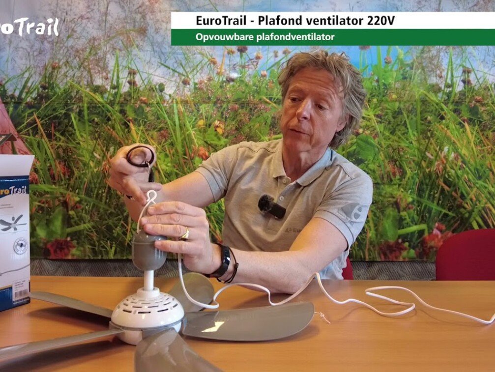 Opvouwbare plafond ventilator. De ventilator is fluisterstil met een hoge luchtstroom. De 5 bladen zijn afneembaar en het geheel heeft daardoor een klein pakvolume. Eenvoudige montage. De ventilator is voorzien van een haak en 3 mtr. lang stroomdraad. Ideaal voor gebruik in de (voor)tent, caravan of thuis. De kleur van de bladen is lichter grijs, op de foto lijkt het donkerder.