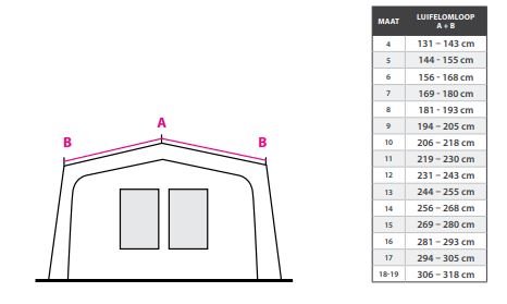 Heeft u een ander merk voortent of weet u de maat van uw Doréma voortent niet meer, stel dan de A-B maat vast van de petluifel en kies dan de juiste maat luifel volgens de maat tabel.