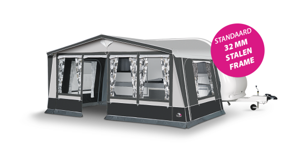 Zowel het dak als de zijwanden zijn volledig uitgevoerd uit PVC-materiaal en daarmee ideaal voor seizoengebruik. De uitwisselbare voorpanelen maken het mogelijk de deur zowel in het midden als rechts te plaatsen. De Ibiza De Luxe is voorzien van afsluitbare raamkleppen voor alle ramen en uitgevoerd met een dubbele ankerhaken. De raamkleppen bieden bescherming tegen nieuwsgierige blikken, tegen te veel zonnestralen op de raamfolie en geven extra zekerheid tijdens uw afwezigheid. De Ibiza is verkrijgbaar in de modieuze kleurencombinatie antraciet/grijs.
