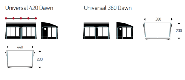De Universal Dawn 360 en 420 staan dus als een huis en zijn bijna elk weerstype de baas. Hierdoor zijn deze voortent modellen uitermate geschikt voor kampeerplezier in alle vier de seizoenen. Lente, zomer, herfst of winter? Jij geniet optimaal van kampeerplezier!